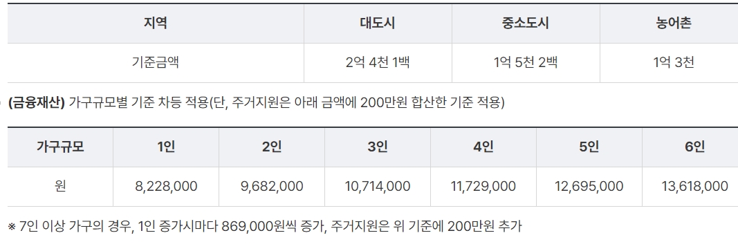 | 재산 | 일반재산+금융재산-주거용재산 공제한도액*-부채 (주거용재산 공제한도액: 대도시 6천9백만원,중소도시 4천2백만원,농어촌 3천5백만원) |
